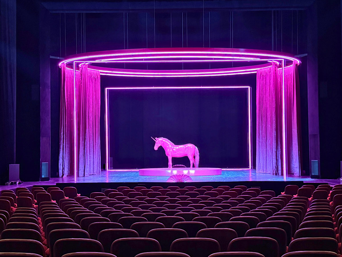 Komplettiert wird das Beleuchtungssystem durch die LDDE NanoPix Slim FR 1536 Vorderlichtfußrampe. Sie bleibt dank ihres extrem flachen 57-mm-Designs für das Publikum nahezu unsichtbar und sorgt zugleich für eine gleichmäßige Ausleuchtung der Bühnenvorderkante. Die Softlight-Rampe integriert 1.536 Micro-LEDs in acht Farben – kann jedoch auch individualisiert werden. Eine integrierte Blende begrenzt den Lichtaustrittswinkel. Der SafetyLight-Modus macht die Bühnenkante auch bei völliger Dunkelheit sichtbar und erhöht die Sicherheit für Künstler:innen deutlich.
