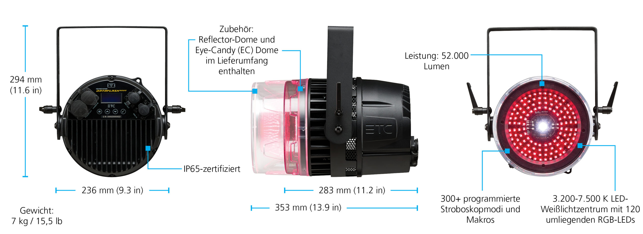 Der mitgelieferte Reflector Dome sowie der EC Dome erweitern die gestalterischen Möglichkeiten zusätzlich, egal ob kraftvolle Strobe-Effekte oder auffällige visuelle Akzente gewünscht sind. Dank der Schutzklasse IP65 überzeugt der Dataflash 5000 sowohl bei Indoor- als auch bei Outdoor-Events mit brillanter Performance.