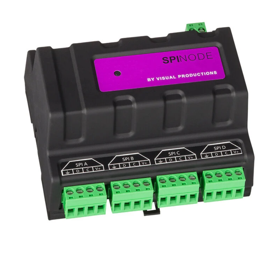 Der SpiNode ist ein leistungsstarker 4-Port-SPI-Konverter, der Art-Net und sACN in SPI-Signale umwandelt und dabei alle gängigen LED-Chip-Protokolle unterstützt – ideal für kreative LED- und Pixel-Installationen. Dank seines kompakten DIN-Schienen-Formats eignet er sich besonders für feste und architektonische Anwendungen. Über eine intuitive Weboberfläche lassen sich Routing, Kanalzuweisungen und Port-Verhalten komfortabel konfigurieren. Integrierte Testfunktionen erleichtern die Inbetriebnahme, z. B. durch das Erkennen von Universums Grenzen, einzelnen LED-Positionen und möglichen Fehlerquellen. In Verbindung mit dem CueCore3 lässt sich der SpiNode nahtlos integrieren und erweitert die Steuerung um bis zu 32 Universen – für maximale Flexibilität bei großflächigen, professionellen LED-Projekten.